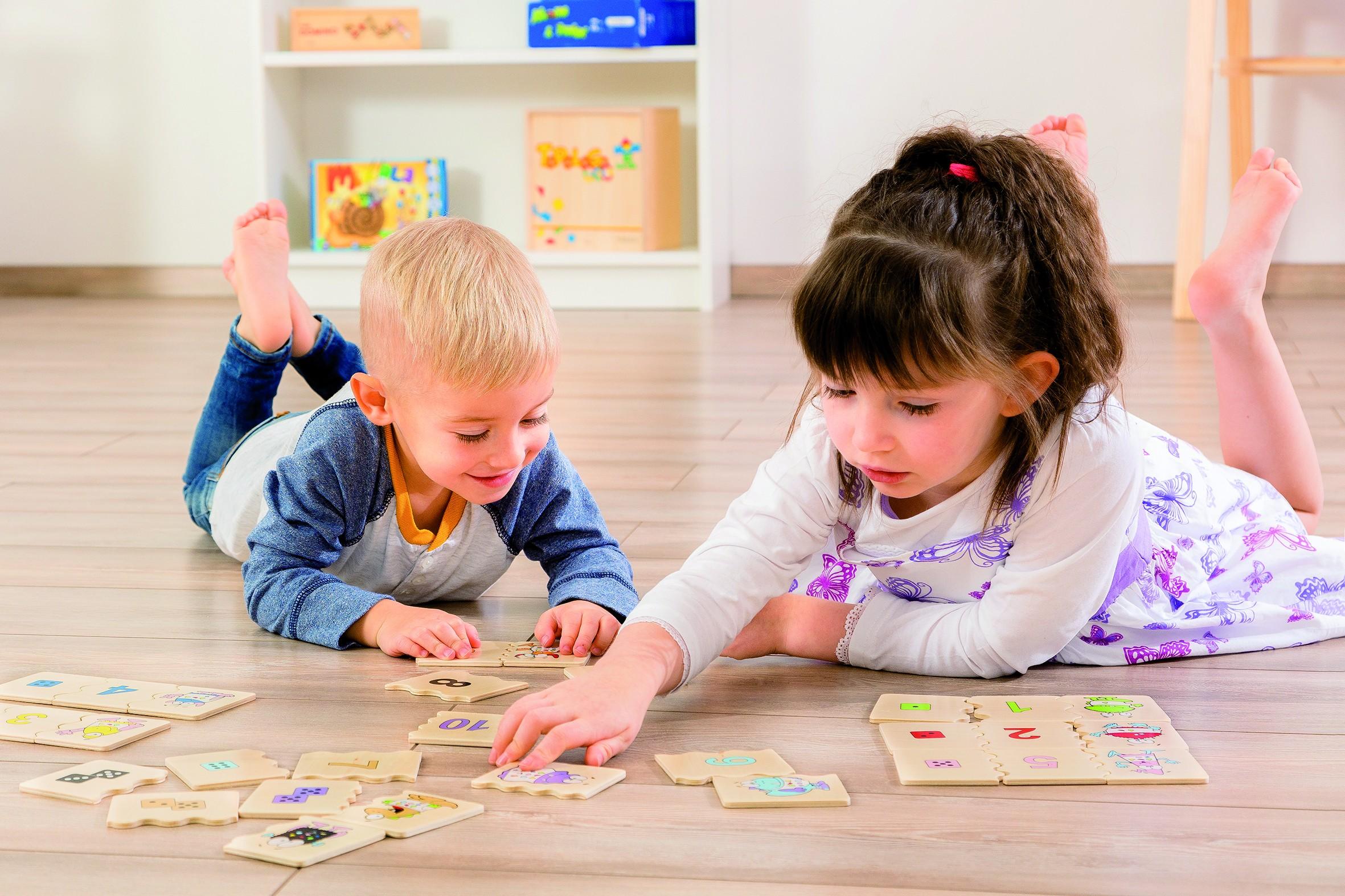 Auf drei verschiedenen zusammengehörenden Puzzleteilen ist die vorgegebene Zahl in unterschiedlicher Weise abgebildet – als geometrische Figur zum Nachzählen, als Ziffer und als Würfelaugen.| Artikelnummer | 41065-2 |