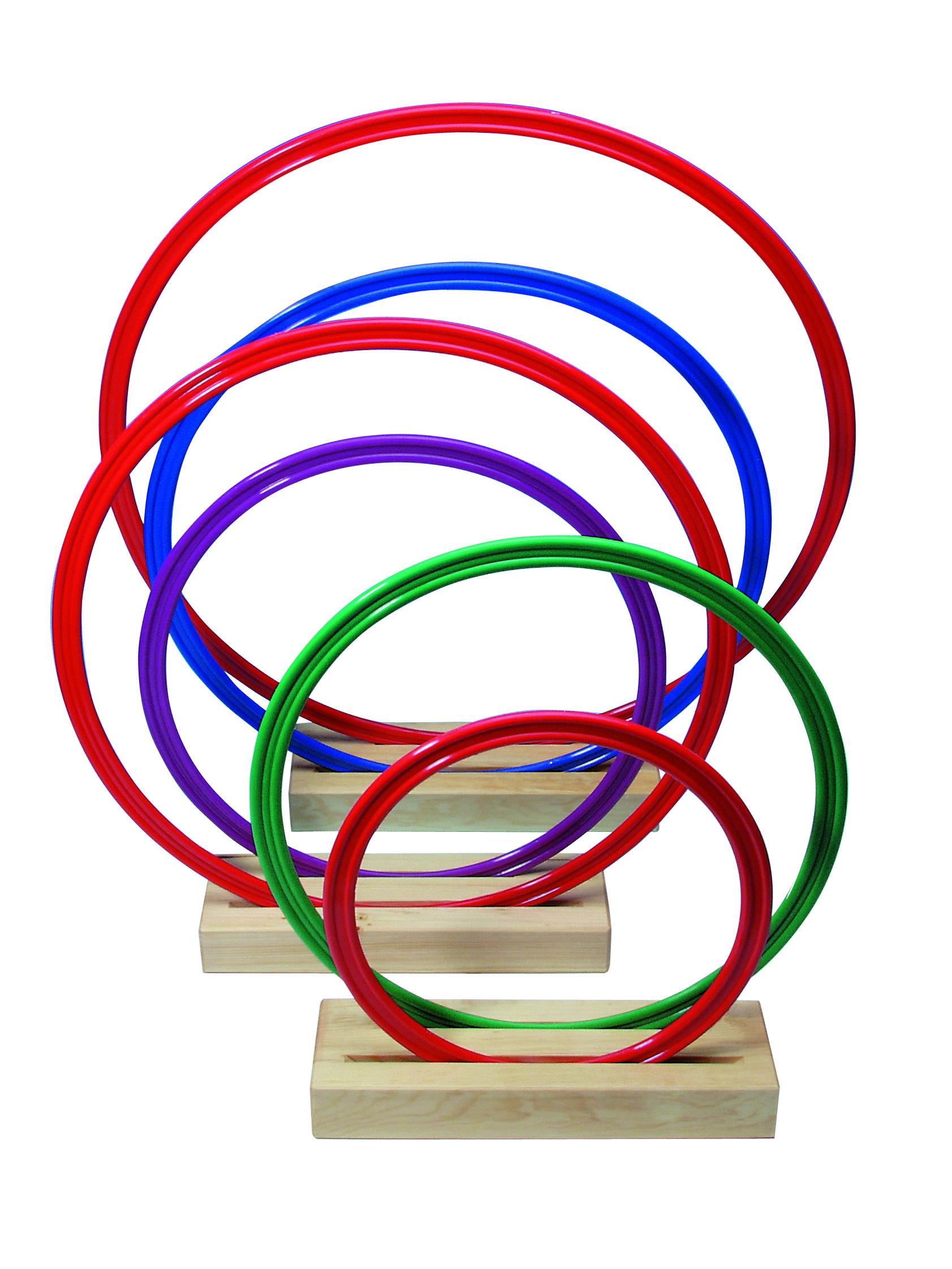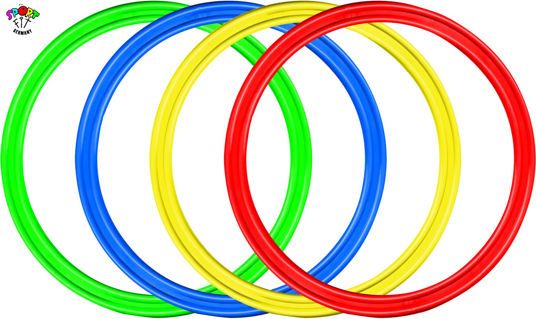 Es handelt sich um vier Gymnastik-Ringe mit einem Durchmesser von 70, 60, 50, 40 und 30 cm. Die Ringe sind aus Kunststoff gefertigt, somit können sie problemlos im Innen- und Außenbereich benutzt werden.